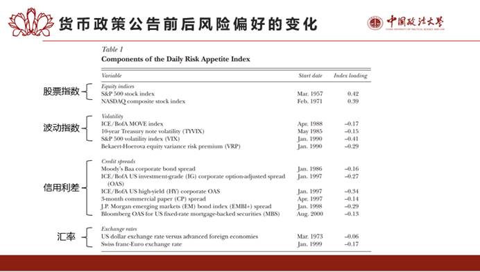 接着,刘卓文同学为大家介绍了论文的实证研究部分。首先回顾了以往关于货币政策与风险资产价格的理论研究。论文以FOMC公告发布,以欧洲美元期货利率的变化,来衡量货币政策意外,并研究货币政策意外对资产价格的影响,然后通过主成分分析法构建新的金融风险偏好指数,分离出风险承担渠道的影响。