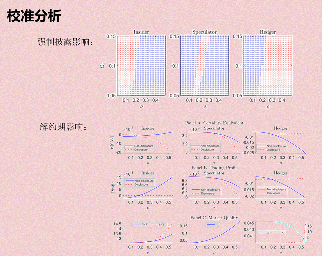 接着,张雨生同学的介绍一共分为四部分。首先介绍了第一部分的模型构建,包含覆盖了三个时期的经济模型和市场参与者的建模;第二部分是模型的均衡与测量,分别构建了披露和非披露下的均衡状态,分析了政策对投资者福利相关的各种变量的影响,并对内部人士在对冲需求足够大的极限情况下进行了单独研究;第四部分是校准分析,评估了强制披露政策和冷静期政策对投资者福利的影响;张雨生同学讲述了文章中内部交易信息披露相关模型构建,再研究内部交易者、对冲者和投机者福利,用等效确定性收益衡量,给出不同制度下福利变量表达式。文章定义并计算不同制度下内部交易者、投机者和对冲者预期交易利润,分析披露制度的影响。后进行极限情况分析,当内部交易者对冲需求足够大时,分析披露影响,包括投资者福利、交易利润、价格信息含量和市场流动性变化。结果显示所有投资者福利可能变差,与传统阳光交易观点相悖,解释原因涉及利润和风险分担渠道,强调风险分担渠道中 Hirshleifer 效应和交易激进效应的作用。文章还对强制披露和冷静期的影响进行了校准分析。分析改变冷静期对投资者福利和预期交易利润的影响,不同制度下冷静期对内部交易者和对冲者影响不同,如不披露制度下短的冷静期利于内部交易者损害对冲者,披露制度下内部交易者从更长冷静期中获益(通过风险分担渠道)且对冲者预期交易利润随冷静期变短而增加。