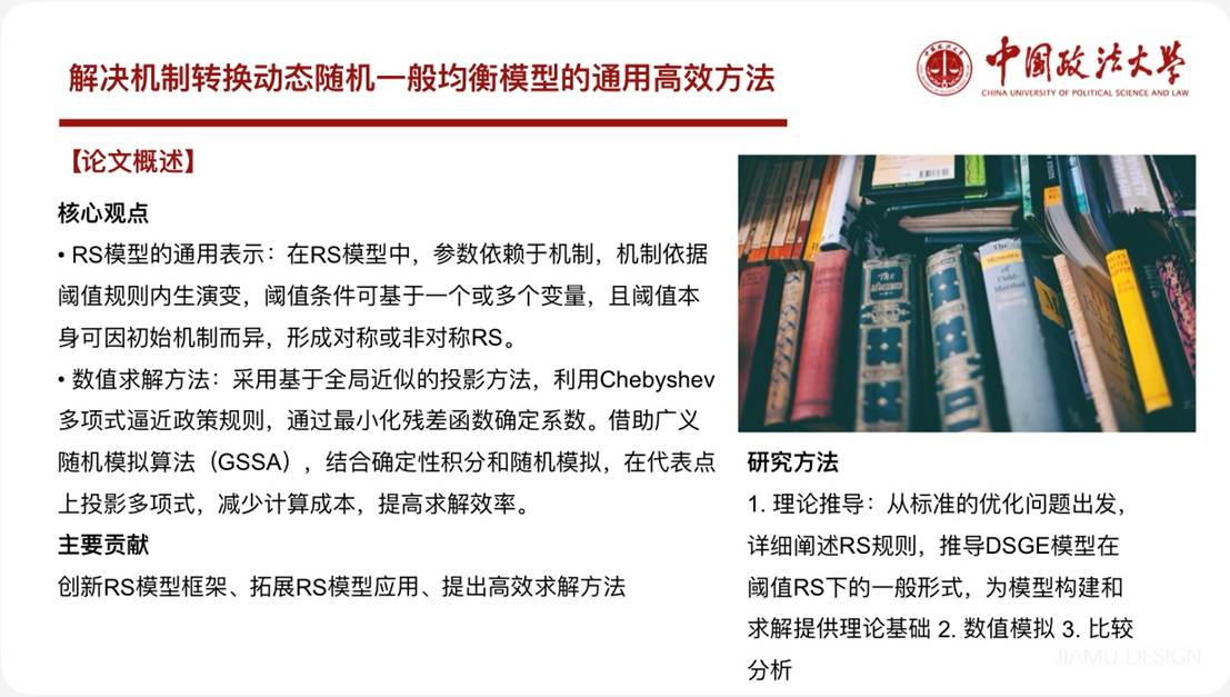 第二部分,陈泓任同学首先针对DSGE模型的优缺点等进行了补充说明,并着重强调尽管DSGE模型存在一些缺点,但DSGE模型仍然是分析宏观经济政策和经济波动的重要工具,研究者可以通过对模型的不断改进和扩展,提高其适用性和预测能力。紧接着,他对自己着重阅读的《用伯努利迭代求解线性DSGE模型》和《解决机制转换DSGE模型的通用高效方法》两篇文献进行了分析,针对研究背景、研究目的和研究的方法与过程分别进行阐述,并对研究结论进行总结,同时也提出了自己的一些思考与感悟。其中他认为比较重要的一点是,跨学科研究可能会为该领域带来新的思路,例如结合计算机科学中的高效算法或数值分析领域的新理论,有望在DSGE模型求解方面取得更大突破。