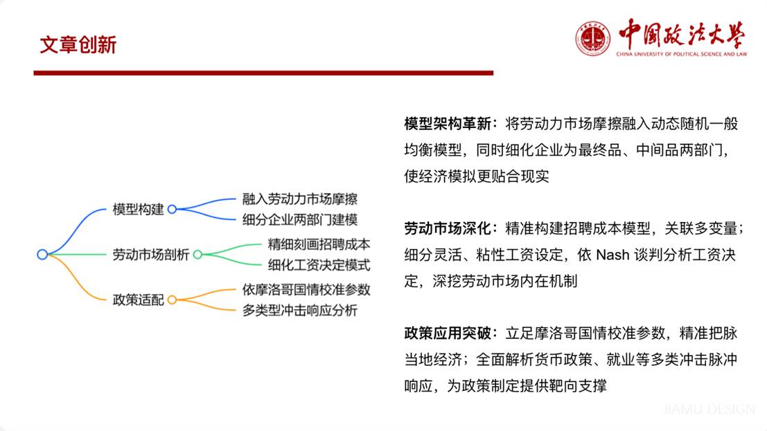 第三部分,史新阳同学对《具有环保意识的消费者的E-DSGE模型》、《金融摩擦和最佳货币政策:分析具有金融摩擦和价格黏性的DSGE模型》以及《摩洛哥的货币政策和失业:DSGE模型对于劳动力市场摩擦和纳什工资谈判的分析》这三篇文献进行了详细梳理和介绍,并相应的进行了许多深入的思考和阐述。对于《具有环保意识的消费者的E-DSGE模型》一文,他从研究背景和意义、模型思路、贝叶斯估计、环境政策影响、稳健性检验多角度展开分析,并基于自己的思考得出了包括但不限于文中所提及的一系列结论。对于《金融摩擦和最佳货币政策:分析具有金融摩擦和价格黏性的DSGE模型》一文,他指出该篇文献构建了含多主体及金融摩擦、价格粘性的DSGE模型,运用2010年至2023年数据模拟校准。对比标准与增强型泰勒规则(纳入信贷增长等变量),经脉冲响应、方差分解及损失函数评估发现:增强型规则改善金融与产出但影响通胀;“逆风而行”(针对信贷与 GDP 增长)利于央行履职,需与通胀及信贷与GDP比率反应协同。此研究为突尼斯政策制定者评估货币政策提供依据,助力其决策,也为我们理解DSGE模型的现实价值提供了宝贵的思路。最后,针对《摩洛哥的货币政策和失业:DSGE模型对于劳动力市场摩擦和纳什工资谈判的分析》一文,他尤其强调,本文从模型架构革新、劳动市场深化与政策应用突破三个角度进行了创新设计,并运用思维导图详细的为大家介绍了具体的思路与延伸的思考。