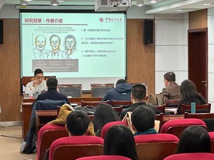 会议伊始,胡继晔老师为同学们做了题为《银行挤提的动态博弈模型》的简短介绍,讲解了完全战略纳什均衡的博弈过程,帮助同学们更好地理解论文所用博弈模型。