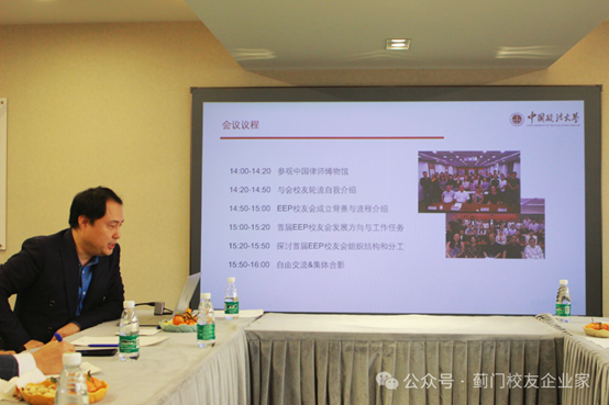 接下来,各位EEP校友进行了自我介绍,并就商学院EEP校友会的成立流程、章程的拟定、未来的发展方向与工作任务、首届EEP校友会的组织结构与分工、未来校友会如何促进EEP项目招生、EEP校友如何为学院的发展贡献力量等问题进行了热烈的讨论与交流。同时,法大企业家俱乐部、法大拓荒牛跑团、法大医疗健康俱乐部的负责人也分享了各自组织校友活动的经验,为即将成立的商学院EEP校友会提供了宝贵的参考意见。