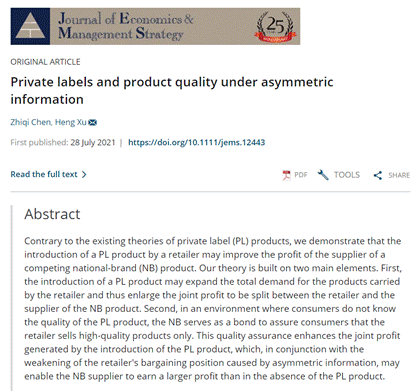 近期,必赢官网法商管理系教师许恒以通讯作者身份在期刊《Journal of Economics & Management Strategy》在线发表题为《Private Labels and Product Quality under Asymmetric Information》的学术论文。该研究探索了在信息不对称环境下零售商推广自有品牌商品的动机,不同于传统理论研究,本文指出在信息不对称环境下零售商的自有品牌策略能够同时提升零售商与其不完全替代产品供应商的利润,本研究对零售商的自有品牌战略和供应商的应对策略提供了重要的理论支撑和实践路径。此前,许恒分别在《管理世界》、《教育研究》、《数量经济技术经济研究》等期刊发表重要成果。